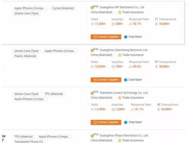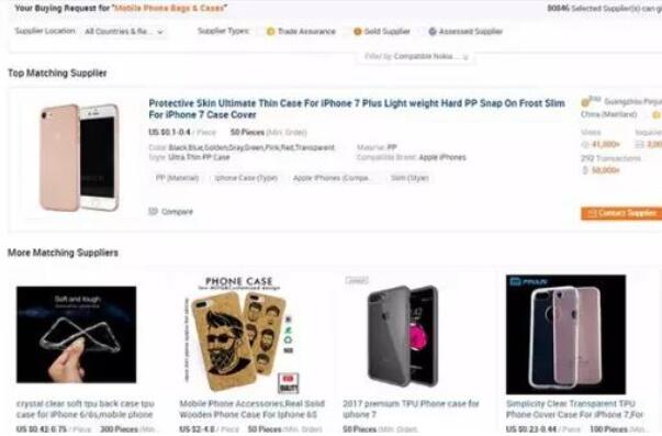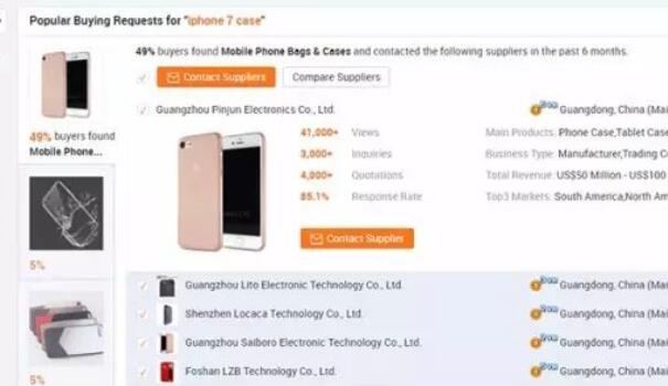 搜索關(guān)鍵詞如iphone 7 case,Ctrl+End定位到頁面最下面Popular Buying Requests for “iphone 7 case”版塊,點(diǎn)擊一家供應(yīng)商打開