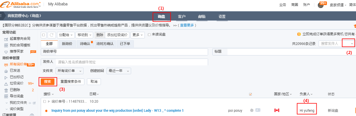 1)主賬號(hào)/業(yè)務(wù)經(jīng)理可以對(duì)詢盤進(jìn)行分配,所以有可能這個(gè)詢盤被主賬號(hào)/業(yè)務(wù)經(jīng)理分配過了,建議可以直接讓主賬號(hào)到“商機(jī)管理中心”-“詢盤”這里面去搜索一下該詢盤,看看目前詢盤負(fù)責(zé)人是誰,具體查看方式如下: