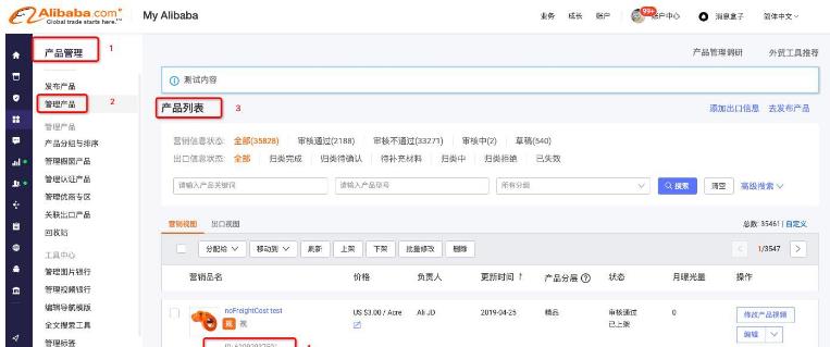 國際站賬號(hào)登錄 My Alibaba 后臺(tái),左側(cè)導(dǎo)航欄找到“產(chǎn)品管理”→“管理產(chǎn)品”→“產(chǎn)品列表”→每一個(gè)產(chǎn)品下面都有一串?dāng)?shù)字,這個(gè)就是該商品的ID啦!