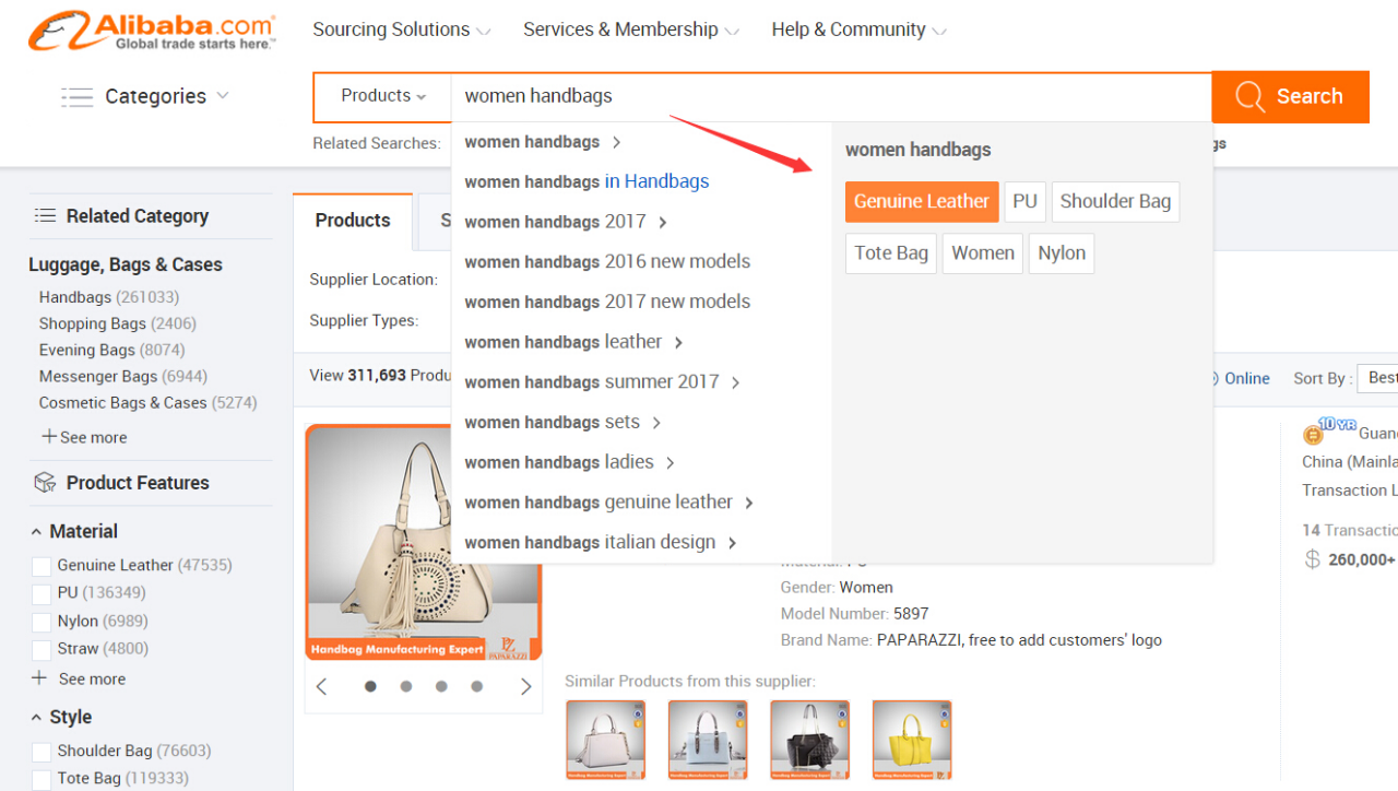 當(dāng)我們把鼠標放在women handbags上時,下拉框右側(cè)會給出擴展詞,比如排在第一位的Genuine Leather:
