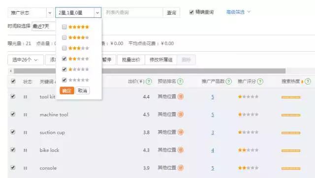 3、推廣星級(jí)匹配:低于三星的推廣詞重新添加對(duì)應(yīng)的產(chǎn)品進(jìn)行匹配推廣;建議用低星級(jí)的推廣詞直接發(fā)布對(duì)應(yīng)的產(chǎn)品加入推廣,星級(jí)提升了再開啟推廣競(jìng)價(jià)