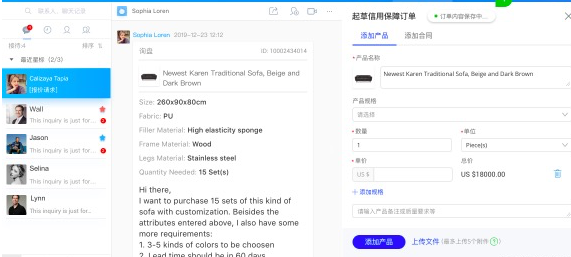 背景:詢盤分配 & 接待+TM咨詢分配 & 接待都可以通過阿里賣家的TM聊天工具完成,所以對于大多數(shù)商家來說,日常只需要登錄阿里賣家即可處理所有商機消息,商機談判下一步就是成交了,現(xiàn)在業(yè)務人員比較頭疼的問題是每次起草訂單都需要打開網(wǎng)頁版訂單后臺才能起草,效率低下。這次升級是在PC阿里賣家聊天頁右側(cè)新增了起草訂單入口,同時展示與該買家的所有訂單及狀態(tài),具體展示如下: