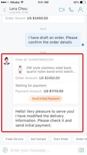 賣家發(fā)送訂單卡片或催付卡片后買家聊天框內(nèi)即可收到消息,有助于提升支付率
