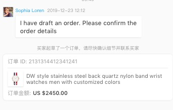 當需要跟買家確認當前溝通訂單情況時,可以發(fā)送訂單卡片給買家,買家側(cè)會展示訂單詳情,雙方可以就該訂單進一步溝通,省去了截圖說明訂單詳情的繁瑣