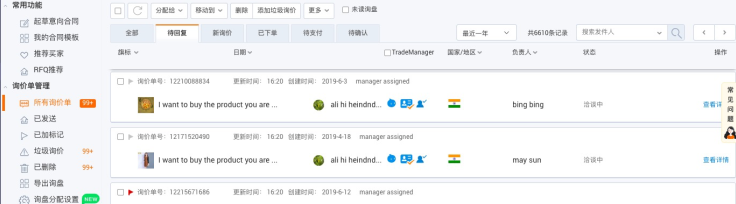 在所有詢價(jià)單列表篩選待回復(fù)的詢盤如下圖,標(biāo)題幾乎一樣,之前聊過什么看不出來,只能一封一封點(diǎn)進(jìn)去看,其實(shí)不用這么麻煩,用好這個(gè)小功能就可以了