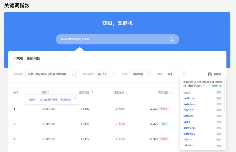 第一步:關(guān)鍵詞指數(shù)頁面,鼠標hover在詞上,顯示出“加入收藏”,點擊后進入到頁面右上角的「收藏詞」