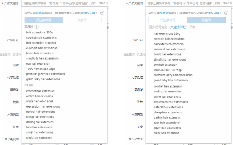 第二步:產(chǎn)品發(fā)布或編輯時,選擇關(guān)鍵詞,下拉出現(xiàn)收藏詞表