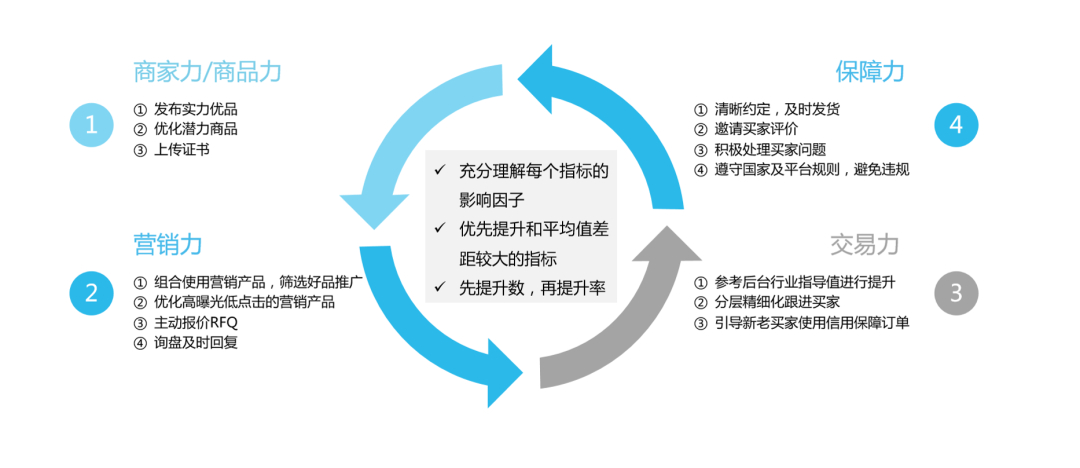 針對先易后難,在商家力/商品力和保障力是基礎(chǔ),也是相對容易的提分項(xiàng),如這兩項(xiàng)沒有達(dá)到60分,應(yīng)首先進(jìn)行優(yōu)化提升。營銷力是商家多場景觸達(dá)買家的能力體現(xiàn),需要商家不斷地花費(fèi)心思進(jìn)行優(yōu)化,并通過時(shí)間沉淀展現(xiàn)。交易力是最終效果的直接體現(xiàn),繩鋸木斷、水滴石穿,只有在平臺(tái)上不斷地耕耘,才會(huì)有巨大的收獲。