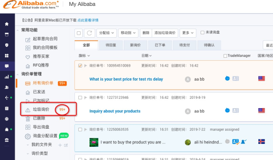 系統(tǒng)識別可能會出現(xiàn)漏網(wǎng)之魚,需要您提高安全意識,防范釣魚風險,及時舉報;還有可能出現(xiàn)“誤殺”的情況,所以建議您看到垃圾詢價有新詢價提醒的時候,及時檢查一下是否確定是垃圾詢盤,如果不是可以移出;如果已經(jīng)超過發(fā)送時間24小時的垃圾詢盤,移出后會影響及時回復率,需要慎重操作