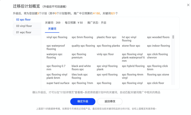 第一步:點(diǎn)擊關(guān)鍵詞升級彈窗——立即升級(舊版關(guān)鍵詞會保留在關(guān)鍵詞管理中,不會丟失)