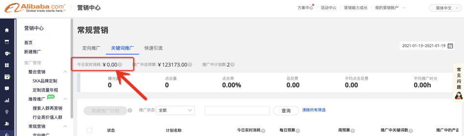 計(jì)劃列表中,您可以查看今日該關(guān)鍵詞計(jì)劃的實(shí)時(shí)消耗、推廣中計(jì)劃的匯總預(yù)算: