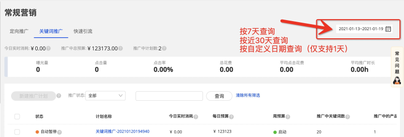 您可以通過現(xiàn)有計(jì)劃列表,篩選時(shí)間周期來查看近7天、30天、以及自定義近1天,查看對應(yīng)數(shù)據(jù);
