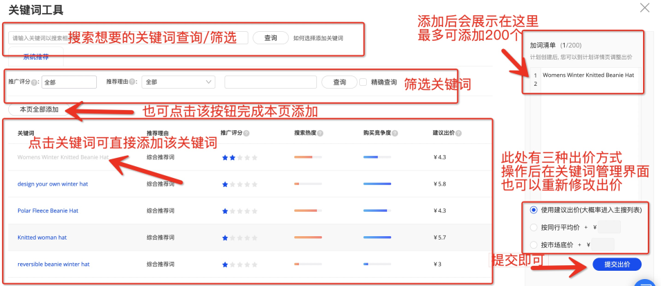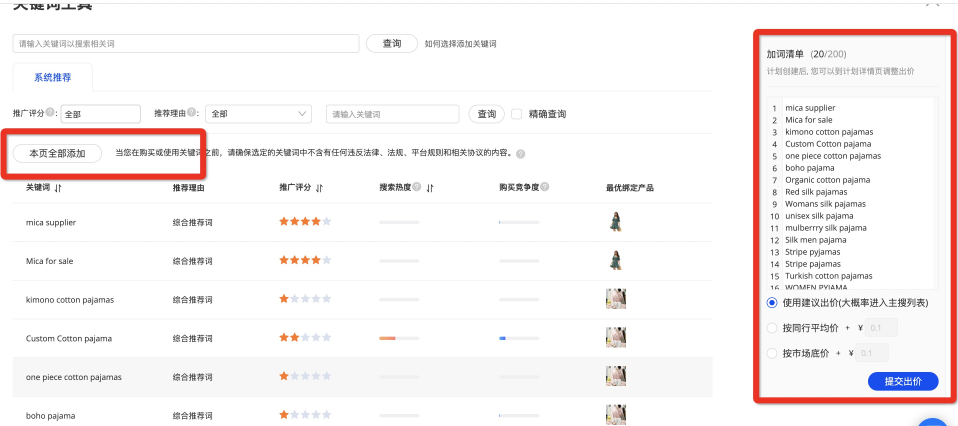 4、選詞、設(shè)置出價(jià)(這里設(shè)置出價(jià)后,您可以在計(jì)劃新建完成后,在詳情中完成單個(gè)詞的價(jià)格調(diào)整),設(shè)置完畢后,點(diǎn)擊【提交出價(jià)】