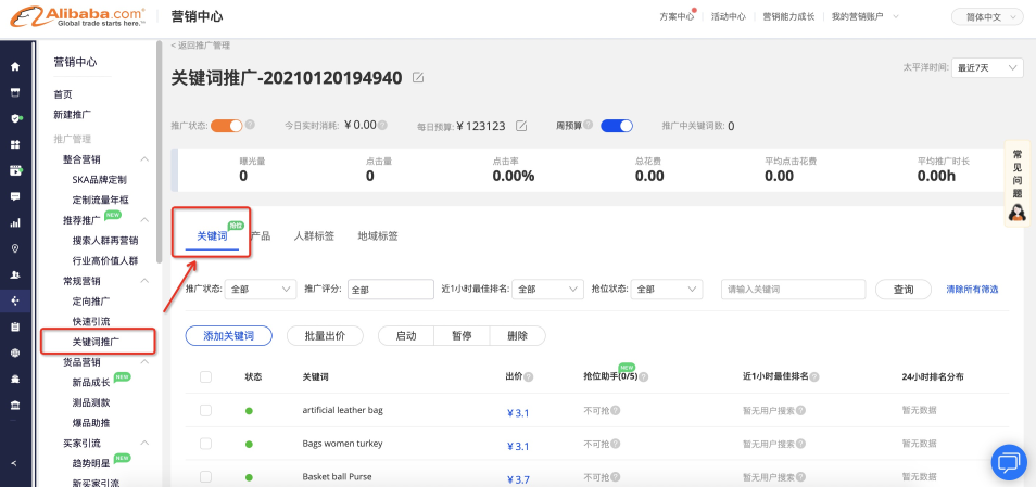 點(diǎn)擊計(jì)劃名稱,進(jìn)入計(jì)劃詳情后,點(diǎn)擊【關(guān)鍵詞】,即可看到您之前在關(guān)鍵詞推廣計(jì)劃中的全部關(guān)鍵詞;您可以在該界面完成關(guān)鍵詞的管理,不支持單個(gè)關(guān)鍵詞與產(chǎn)品的綁定與關(guān)聯(lián);