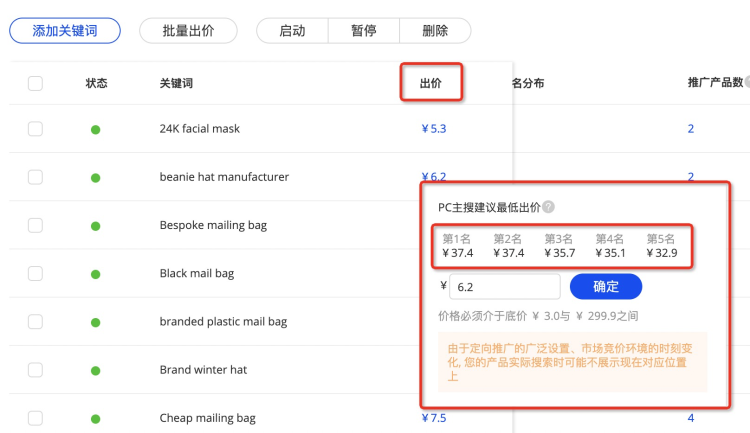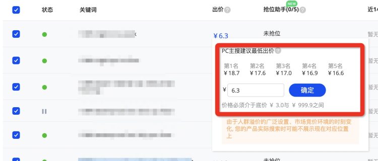 會根據(jù)關(guān)鍵詞當(dāng)前的競爭數(shù)據(jù),給到您進(jìn)入PC主搜的建議價(jià)格,您在當(dāng)前界面設(shè)置完畢價(jià)格后,點(diǎn)擊確定即可;