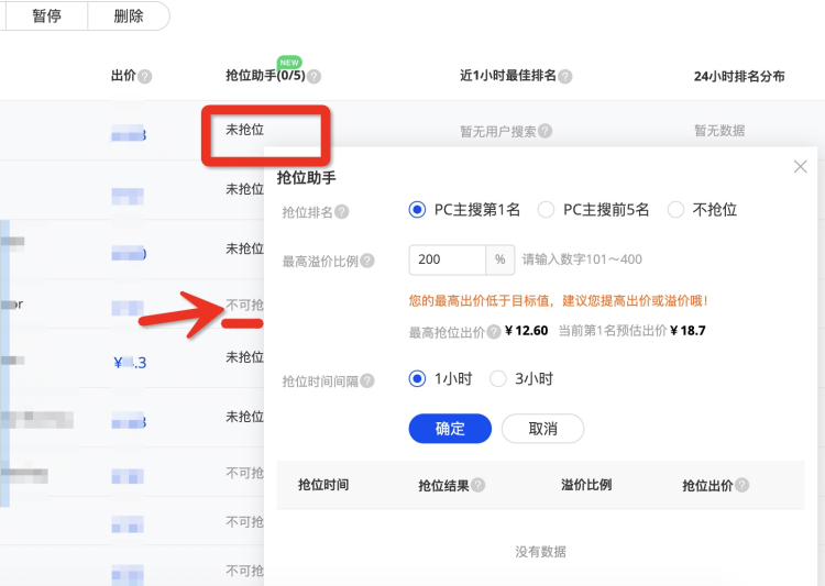 如您的關(guān)鍵詞推廣評分在3星以上,即可設(shè)置搶位,反之不可搶位;