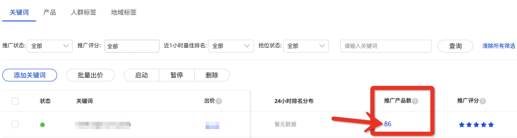 點(diǎn)擊【關(guān)鍵詞】下方,【推廣產(chǎn)品數(shù)】下方的數(shù)字,即可查看當(dāng)前該關(guān)鍵詞所關(guān)聯(lián)的對應(yīng)商品;