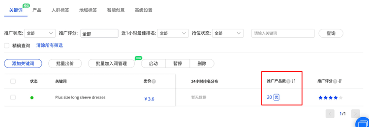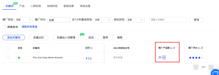 點(diǎn)擊【推廣產(chǎn)品數(shù)】下方的數(shù)字,即可查看當(dāng)前該關(guān)鍵詞所關(guān)聯(lián)的對應(yīng)商品;(此處可以設(shè)置優(yōu)先推廣)