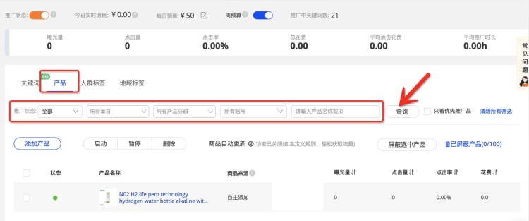 可根據(jù)當(dāng)前商品的推廣狀態(tài)、當(dāng)前商品的發(fā)布類目、您自身針對商品的分組、以及操作人員賬號、或輸入產(chǎn)品名稱或者商品ID,點(diǎn)擊查詢,即可完成計(jì)劃商品篩選;商品名稱輸入匹配不分大小寫;