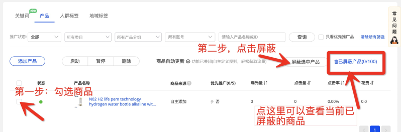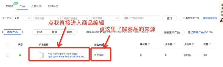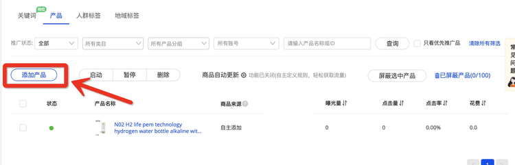 - 您的自主添加商品除非您手動刪除,否則不會因您開啟商品自動更新,而被踢出計(jì)劃,不被推廣;(如您自主添加的商品在屏蔽品當(dāng)中,則該產(chǎn)品還是會被推廣、產(chǎn)生花費(fèi)的哦)