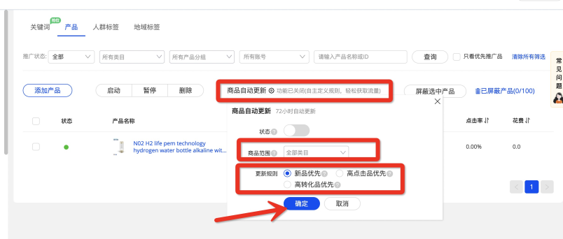 添加方式2:您可以點(diǎn)擊【商品自動更新】,設(shè)置不同類目商品自動更新加入計(jì)劃(新品優(yōu)先、高轉(zhuǎn)化優(yōu)先、高點(diǎn)擊優(yōu)先);