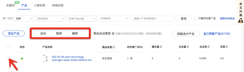 您可以先勾選商品,再點(diǎn)擊啟動、暫?;騽h除,完成批量操作;