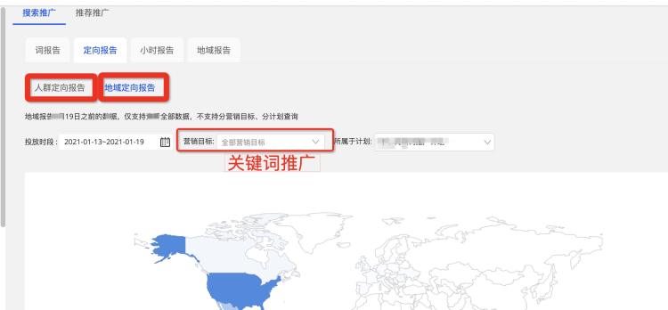 新增數(shù)據(jù)部分:您可以點(diǎn)擊定向報(bào)告,篩選關(guān)鍵詞推廣營銷目標(biāo),查看您的人群、地域報(bào)告;