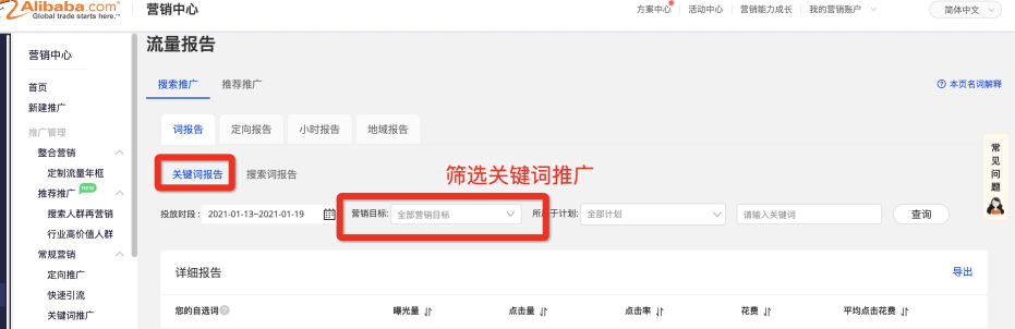 (如您找不到關(guān)鍵詞推廣的營銷目標(biāo),也可以通過計(jì)劃,篩選關(guān)鍵詞計(jì)劃查看數(shù)據(jù);)