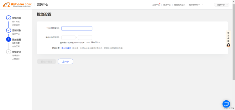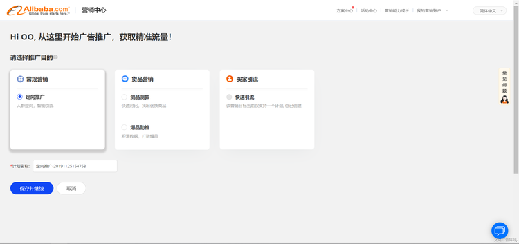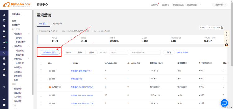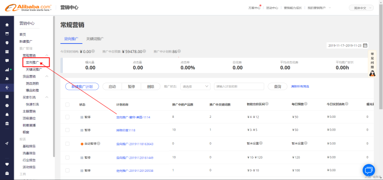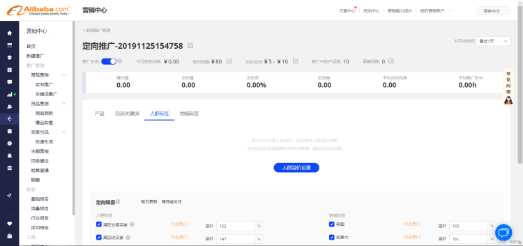 打開營(yíng)銷中心后,點(diǎn)擊進(jìn)入到外貿(mào)直通車首頁(yè),點(diǎn)擊左側(cè)導(dǎo)航欄“定向推 廣”