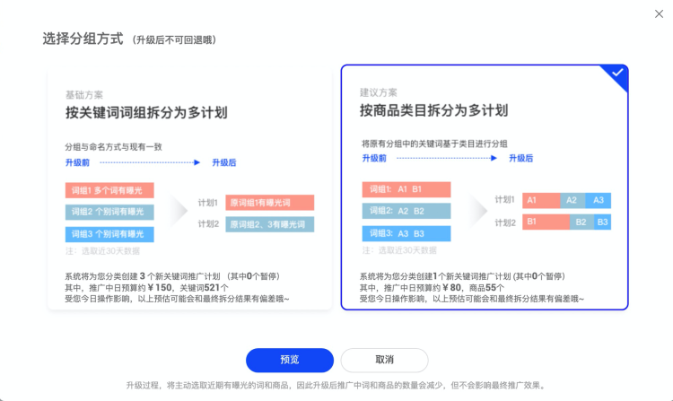 6、關(guān)鍵詞升級(jí)時(shí),可分拆計(jì)劃進(jìn)行推廣;(目前正逐步灰度升級(jí)中,敬請(qǐng)期待)