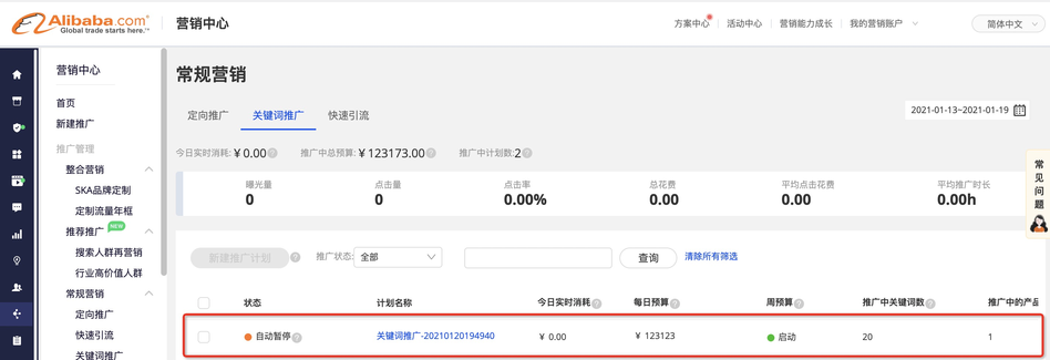 完成升級(jí)后,點(diǎn)擊導(dǎo)航【關(guān)鍵詞推廣】,即可看到當(dāng)前的計(jì)劃列表;