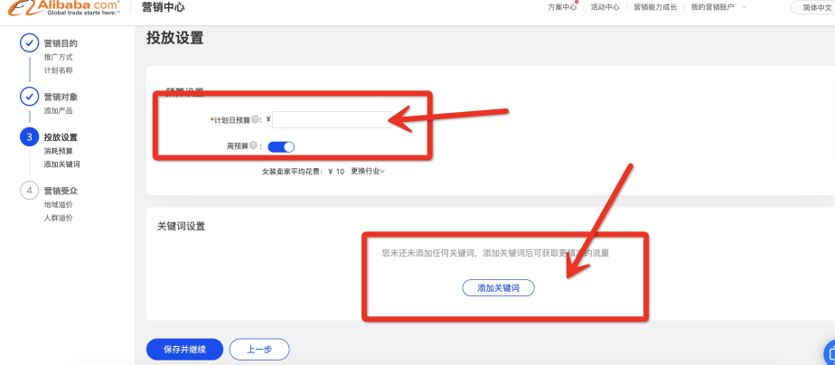 3、設(shè)置計(jì)劃日預(yù)算(默認(rèn)為您開啟周預(yù)算,可以點(diǎn)擊關(guān)閉),點(diǎn)擊【添加關(guān)鍵詞】,開始設(shè)置推廣關(guān)鍵詞;