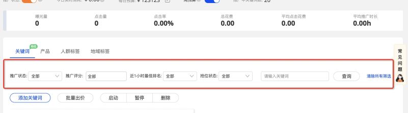 推廣狀態(tài):篩選當(dāng)前不同狀態(tài)的關(guān)鍵詞;