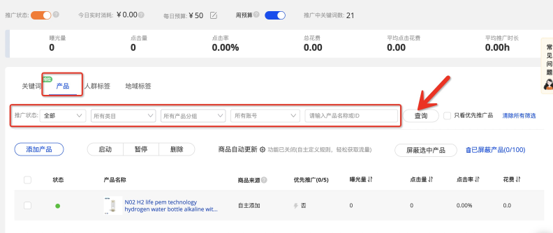 可根據(jù)當(dāng)前商品的推廣狀態(tài)、當(dāng)前商品的發(fā)布類目、您自身針對(duì)商品的分組、以及操作人員賬號(hào)、或輸入產(chǎn)品名稱或者商品ID,點(diǎn)擊查詢,即可完成計(jì)劃商品篩選;商品名稱輸入匹配不分大小寫;