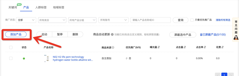 - 您的自主添加商品除非您手動(dòng)刪除,否則不會(huì)因您開啟商品自動(dòng)更新,而被踢出計(jì)劃,不被推廣;(如您自主添加的商品在屏蔽品當(dāng)中,則該產(chǎn)品還是會(huì)被推廣、產(chǎn)生花費(fèi)的哦)