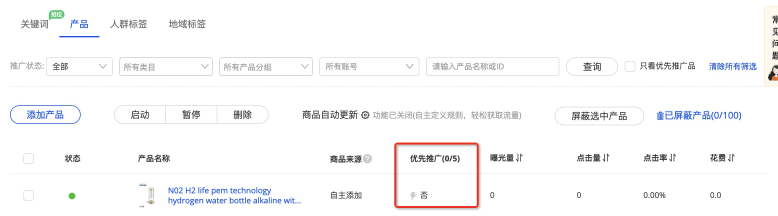 如您點(diǎn)擊【只看優(yōu)選推廣品】,將僅展示您當(dāng)前計(jì)劃的5個(gè)優(yōu)先推廣品;