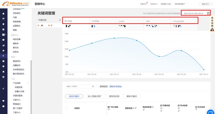 可以查看詞組里關(guān)鍵詞所處的推廣計劃個數(shù)、搜索熱度(搜索熱度反映在過去30天內(nèi),關(guān)鍵詞被海外買家搜索次數(shù)。紅色線條越長,搜索熱度越大;反之,則越小。)、購買競爭度(指外貿(mào)直通車客戶針對某關(guān)鍵詞參與競價的激烈程度。藍(lán)色條形圖越長,代表同行對該詞的關(guān)注程度越高、競爭度越激烈)、近7天曝光/點(diǎn)擊/點(diǎn)擊率/平均點(diǎn)擊價格