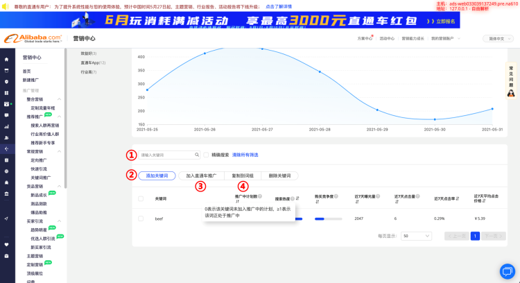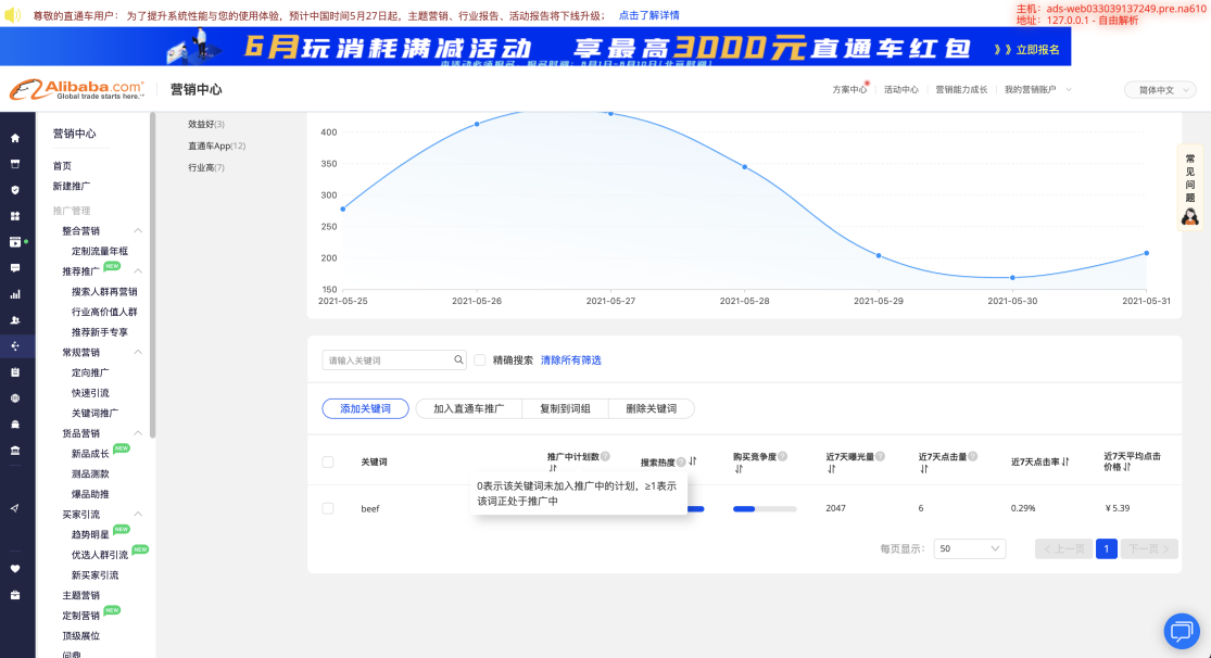 推廣中計劃數(shù):0表示該關(guān)鍵詞未加入推廣中的計劃,≥1表示該詞已加入推廣中計劃的數(shù)量