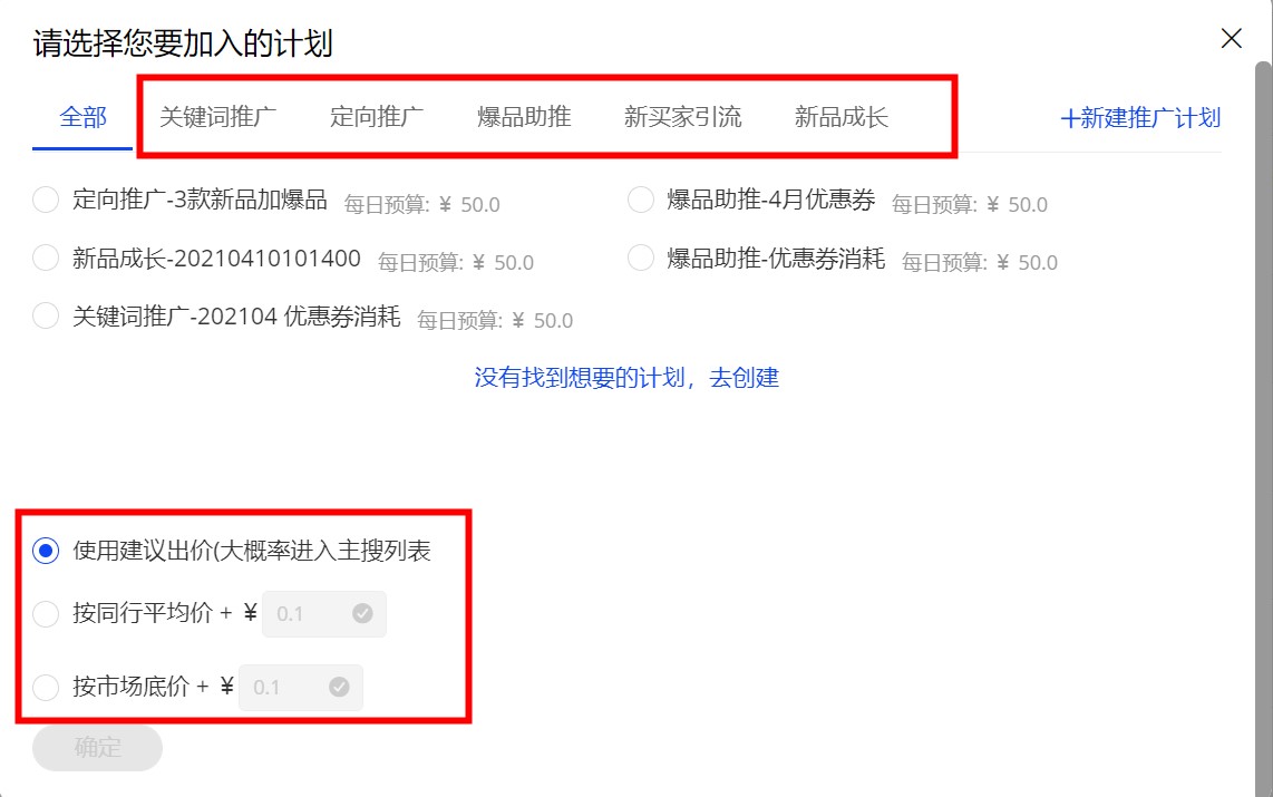 選擇加入直通車推廣后,跳轉(zhuǎn)如下,有三種出價方式:使用建議出價、按同行平均價、按市場底價,點(diǎn)擊確認(rèn)后,可以去關(guān)鍵詞推廣計劃里修改關(guān)鍵詞出價