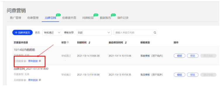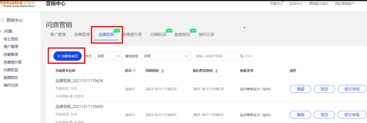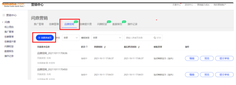 “營銷中心-問鼎后臺-品牌官網(wǎng)”點擊創(chuàng)建承接頁,點擊推品模板“開始制作”