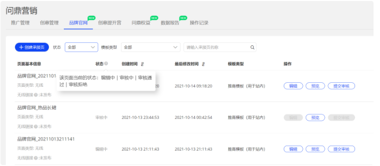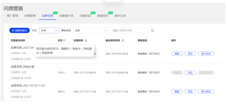 - 提交審核后,系統(tǒng)自動跳轉(zhuǎn)到品牌官網(wǎng)的list頁面,這里面你可以查看制作官網(wǎng)目前的狀態(tài)。