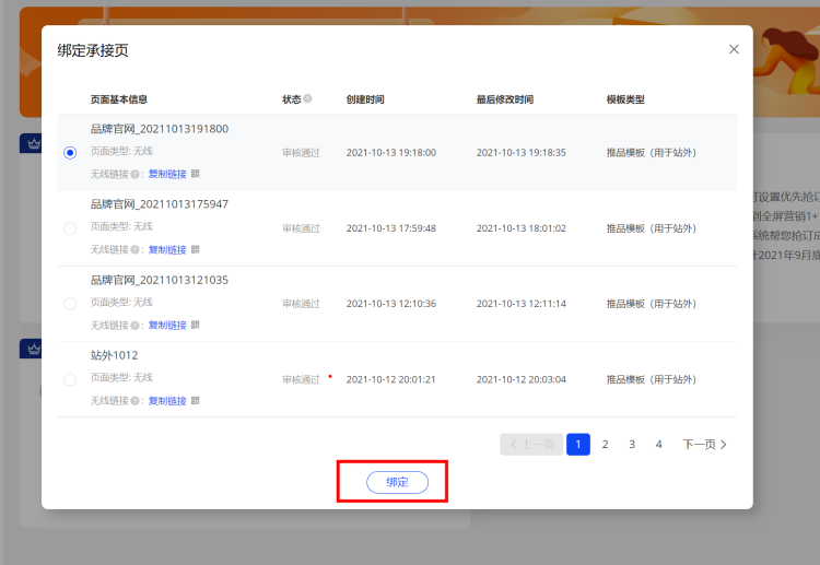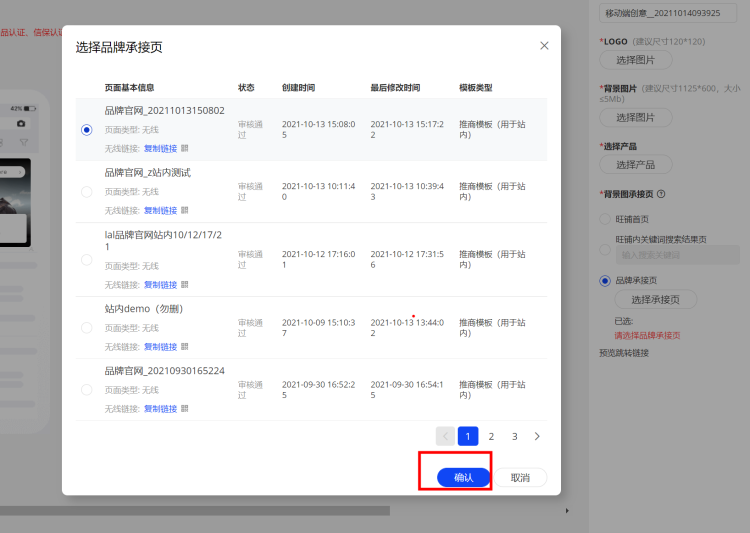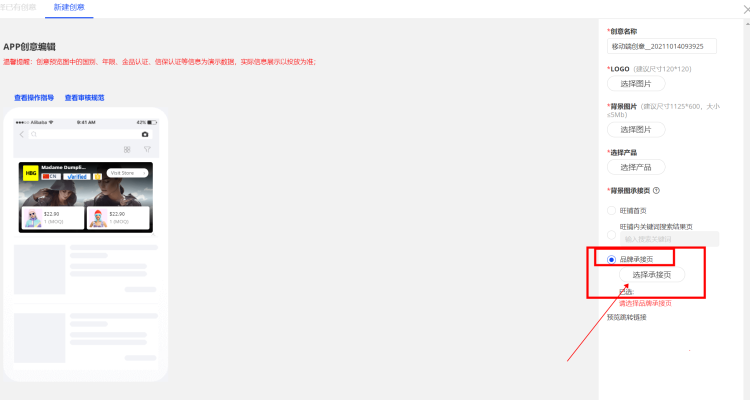 當制作的頁面審核通過后,就可以開始綁定創(chuàng)意投放了,在新建移動創(chuàng)意時,背景圖承接頁一項,選擇“品牌承接頁”,在彈窗中選擇審核通過的,點擊確定即可