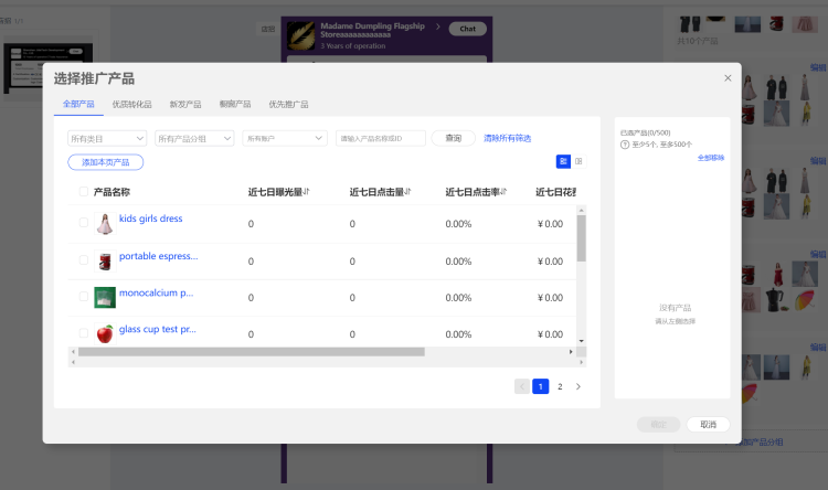 點擊右側(cè)“添加產(chǎn)品分組”,選擇添加需要站外投放的產(chǎn)品,至少50個,最多500個。