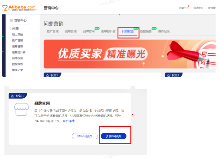當制作的頁面審核通過后,就可以開始綁定創(chuàng)意投放了,在問鼎后臺-問鼎權(quán)益-品牌官網(wǎng)權(quán)益中,點擊“外投承接頁”,勾選綁定審核通過的頁面即可