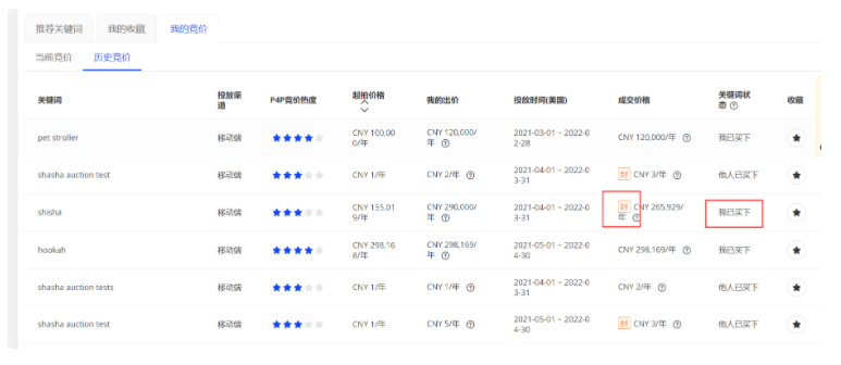 c.出過(guò)價(jià)的關(guān)鍵詞,可在“我的競(jìng)價(jià)”中進(jìn)行查看