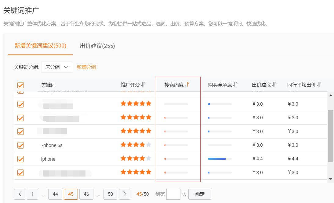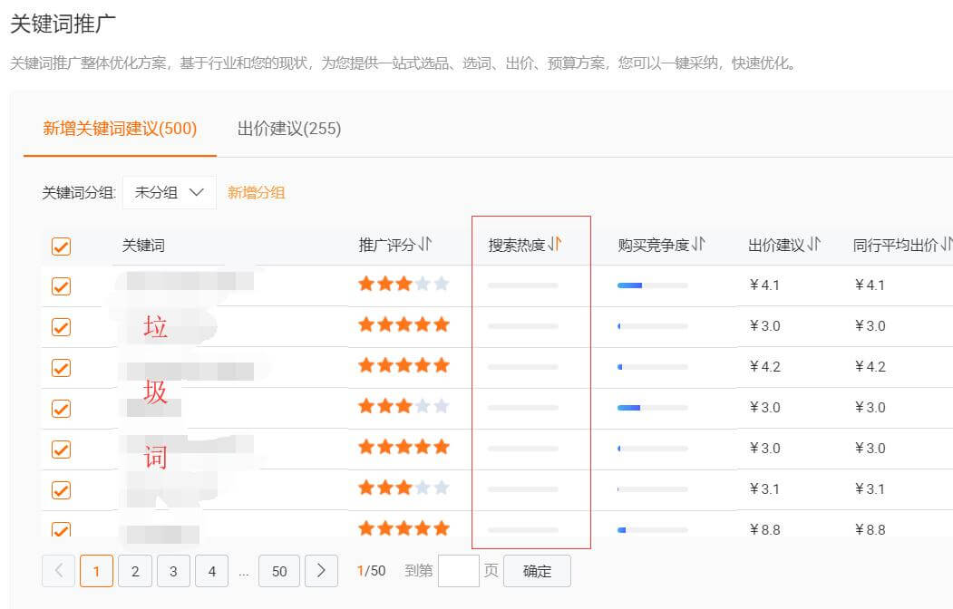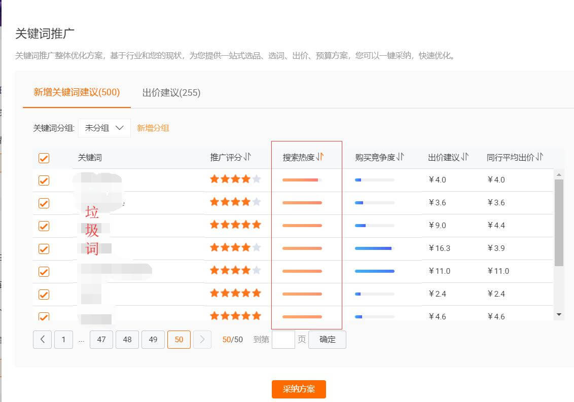 1、打開關(guān)鍵詞推廣方案,一堆垃圾詞。先按關(guān)鍵詞搜索熱度排序,從低到高。方案包給的關(guān)鍵詞竟然還有沒搜索熱度的垃圾詞。